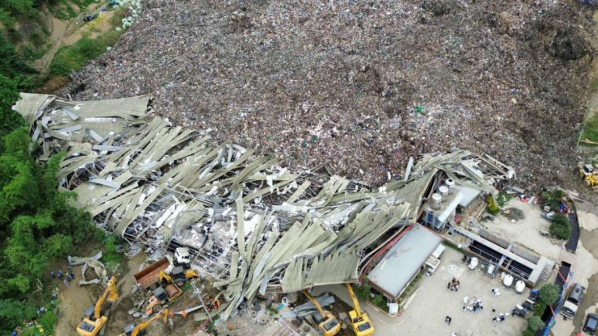 Aerial images released by authorities showed the alarming scale of the collapse, with wide sections of the landfill visibly displaced. Twisted roofing materials, bent metal frames, and partially buried heavy equipment were scattered across the site. In several views, layers of compacted trash appeared to have slid downward in a powerful mass, exposing the dangerous instability of the landfill’s structure.