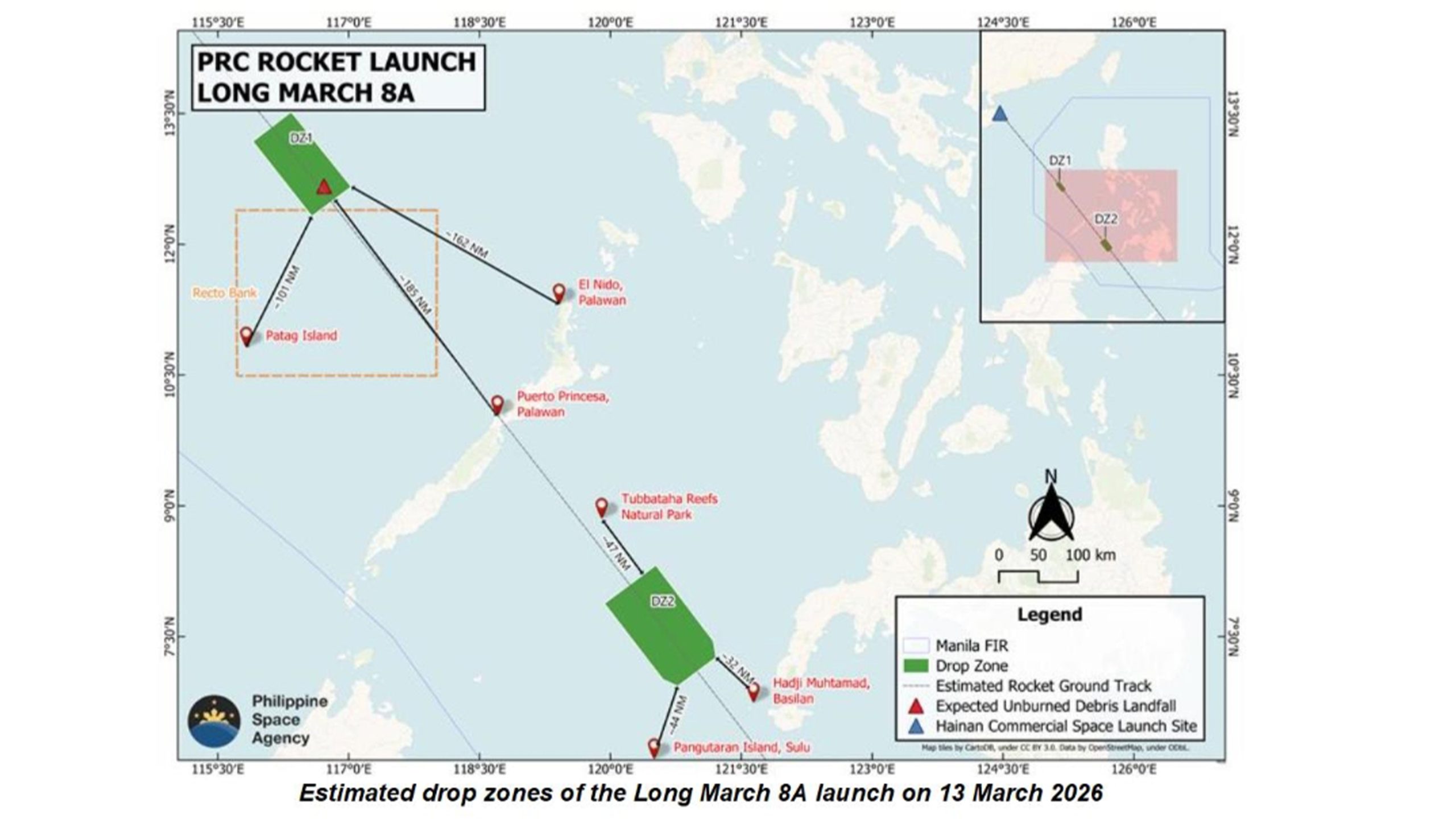 Quezon City — The Philippine Space Agency (PhilSA) confirms the launch of the Long March 8A rocket from the People’s Republic of China. Expected debris from the rocket launch was projected to have fallen within the identified drop zones: approximately 162 NM away from El Nido, Palawan, 185 NM away from Puerto Princesa, Palawan, and 101 NM away from Patag Island (DZ 1); and 32 NM away from Hadji Muhtamad, Basilan, 44 NM away from Pangutaran Island, Sulu, and 47 NM away from Tubbataha Reefs Natural Park (DZ 2). The first drop zone is within the Philippine Exclusive Economic Zone (EEZ) while the second drop zone is within Philippine archipelagic waters.