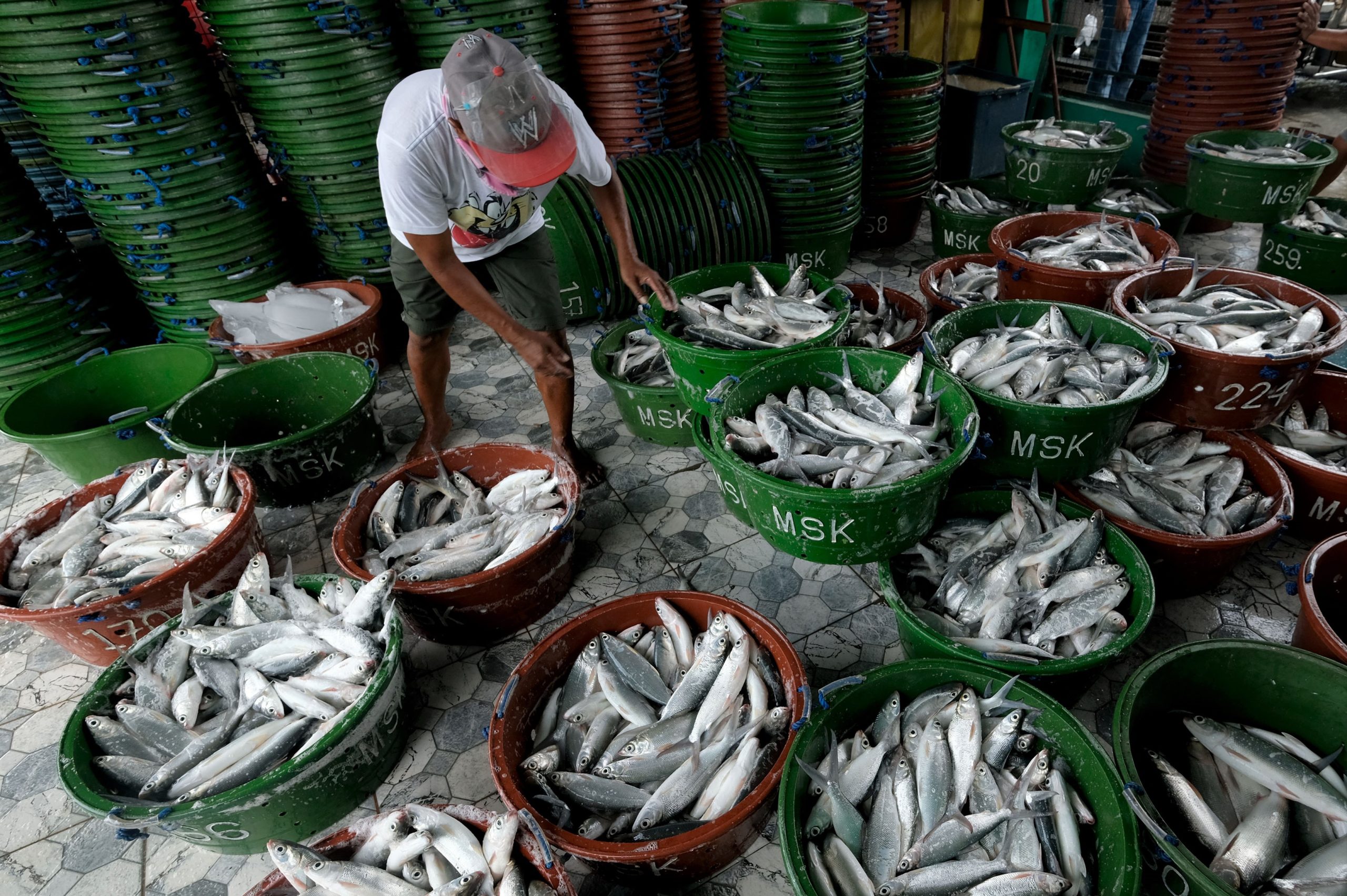 Bangus or milkfish displayed in baskets at a local market, as concerns grow over microplastics in fish