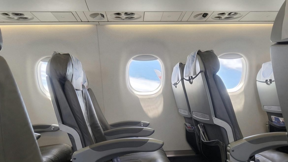 Empty economy class airline seats inside a commercial aircraft cabin